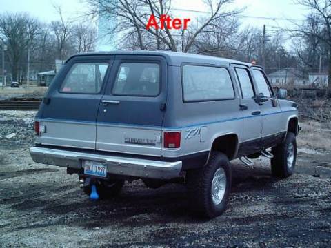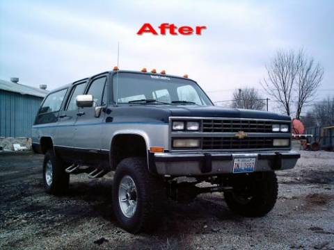 I bought the truck with the hopes of lifting it and putting larger tires on it. About a year after I bought it I installed a 4" Rough Country suspension lift. This included 4" lift springs in the front, new shocks (duals in the front), a new steering stabilizer, an adjustable drop drag link to keep the steering geometry stock and rear blocks. I then put wheels and tires that were take-offs from a Hummer H2. The wheels are 17" wheels with 315/70-17 BFGoodrich AT TA/KO's (About as close to 35x12.50x17's as you can get). The tires are great on the highway and are very capable in the mud and snow. The truck has a 14 bolt corporate 9.5 inch ring gear rear end with a limited slip and drum brakes. I am building a 14 bolt corporate 10.5" with a locker and disk brakes for it now. The front diff is a GM 10 bolt and I plan to replace it with a Dana 60. Within the next year the motor will come out and will be rebuilt with some modest modifications, i.e. a more aggressive cam, heads, and an aftermarket TBI. I like the fuel injection because it helps with gas mileage.