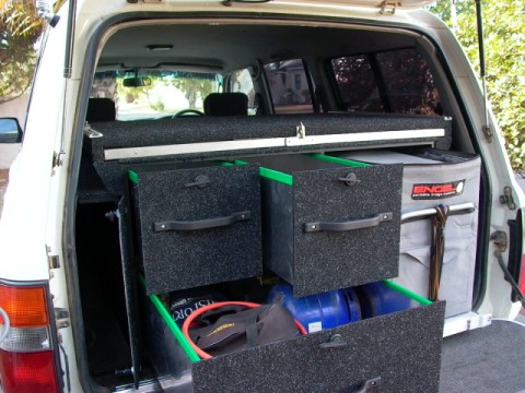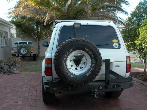 Already installed are an ARB front bumper with 9000lb winch and KC spotlights, Safari snorkel, dual battery system, OME shocks and springs, long range fuel tank 33 x 12.5 x 15 Goodyear Wrangler mud tires, custom made steel rear bumper with sparewheel holder. Inside we have a custom drawer system in the loadbay with Engel 40Lt fridge and 50Lt water tank, canvas seat covers and Garmin 176 GPS. On top are load bars which take either a roof-rack or a roof-top tent.