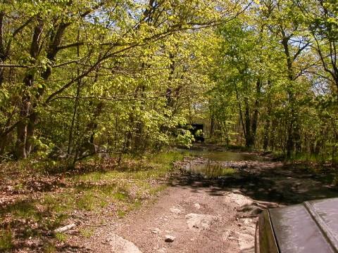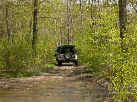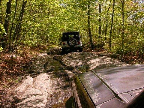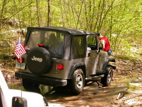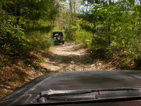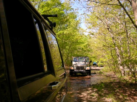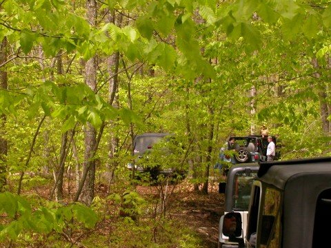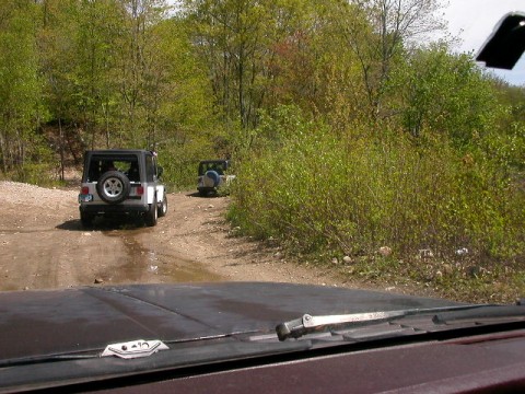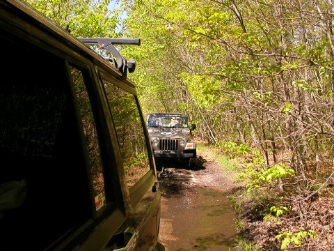 So the trails were limited to 25 Jeeps per trail - to eliminate overcrowding. There were 2 trails available in 2 State Forests. Members of the 4WD Club, the Eastern 4 Wheelers, helped lead us into the State Forests - so no one would get lost! The day started off nice, but by noon time, a strong cold front moved in and thoroughly drowned out the afternoon. Everyone had a great time as evidenced by the photos. To get the shots, both forward & backward, I stuck my digi cam out the window periodically as I drove! To get the shots in front of me, I took pix (with the flash off) through the front windshield.