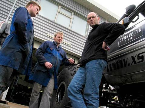 Steinar Aegisson, Aegir and Arni from local car inspection company, Adalskodun discussing things.