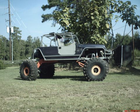 Hand made frame, suspension, full hydraulic steering, front and rear, front and rear winches, custom cage inside and out, old school 355 double hump heads with throttle body fuel injection, turbo 350, Chevrolet 203 to Dana 300 with 4 to 1 kit. 1350 U joints at transfer case. 1410's on axles. 1/4" steel plate rear trailing arms. Schedule 80 wishbones. Drivetrain brakes, custom aluminum fuel cell.