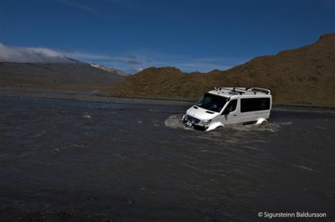 Crossing the glacial river Krossa is not too hard for the Sprinter. You can see how deep it is by the fact that the 44 inch tires are completely under water.