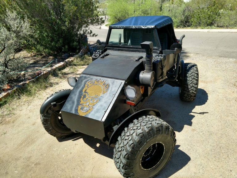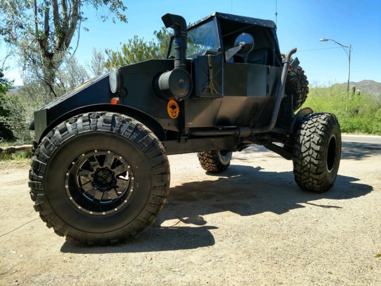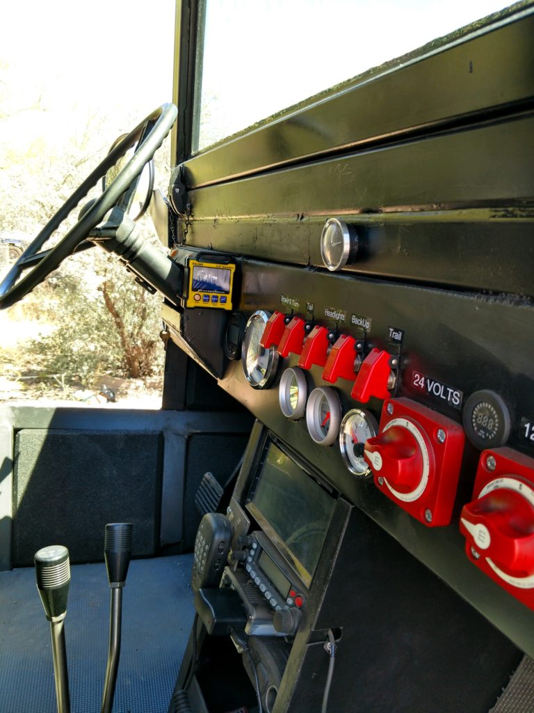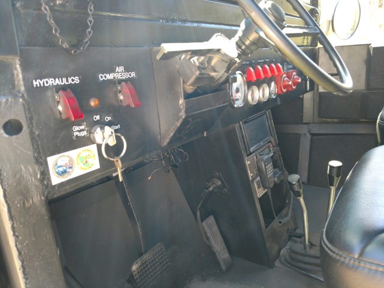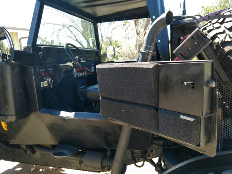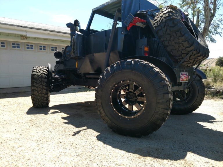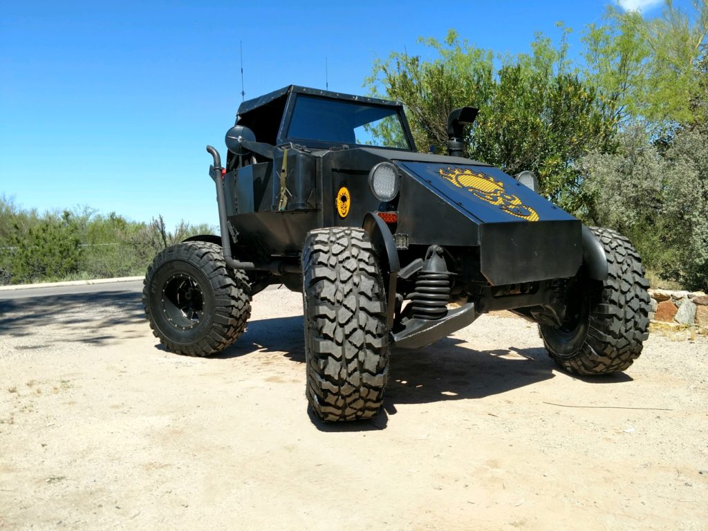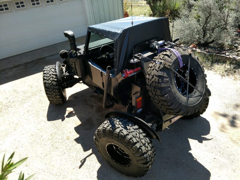 I shortened the wheelbase 24 inches, added rear steering, swapped the 242 transfer case for an NP205 converted to dual shift, added full carriage Eaton Detroit Lockers to both differentials, added an on-board compressor for tire air and gear case pressure regulation, all steel body, perforated steel belly pans, fenders that turn with the wheels and have LED trail lights mounted to them, LED headlights putting out 22.5K lumens, vinyl convertible top, lay down windshield, GPS speedometer, tachometer, dual plain inclinometer, water proof switches, gauges, LED lights and wiring, 16 inch Flex-A-Lite variable speed fan, V340BT JVC stereo with 10 inch kickers, 1400 watt inverter, YAESU FT-7900R/E dual frequency transceiver, comet antennas, spare tire loading winch, backup camera, jerry-can holders, etc.