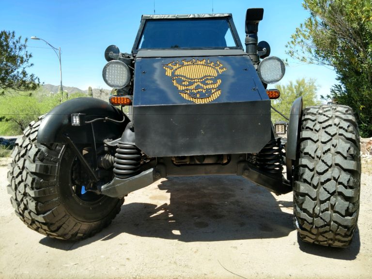I included only one picture with the top down but none with the cargo rack attached. Also, under the flaming skull is perforated steel. The skull cutout is easily removed by removing four bolts and a broad louvered grill, for maximum air flow, can be bolted in it's place. I built the entire thing in the one car garage the pictures were taken in front of. Also, I did everything but upholster the seats.